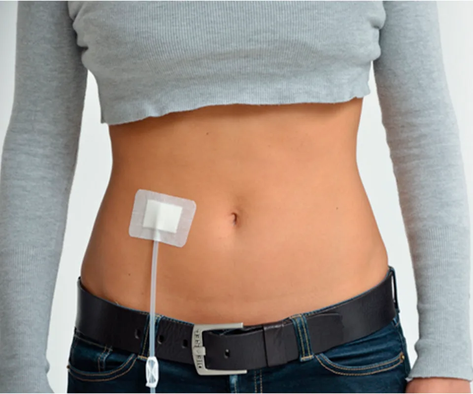 1) um cateter permanente, flexível e indolor é inserido na região abdominal por