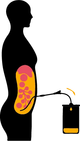 2) durante o processo, uma solução de limpeza flui para dentro do abdômen pela ação da gravidade – da mesma maneira quando se toma soro;
